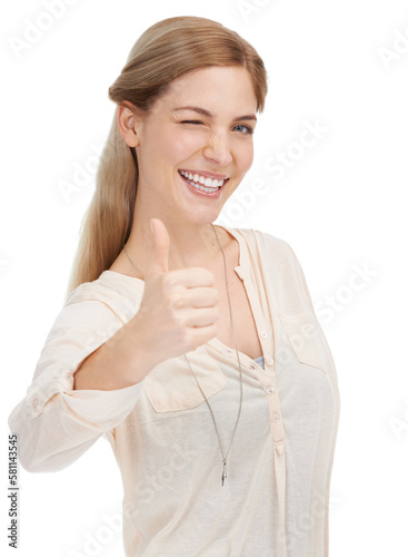 Aces. Studio shot of an attractive young woman giving you thumbs up against a white background.