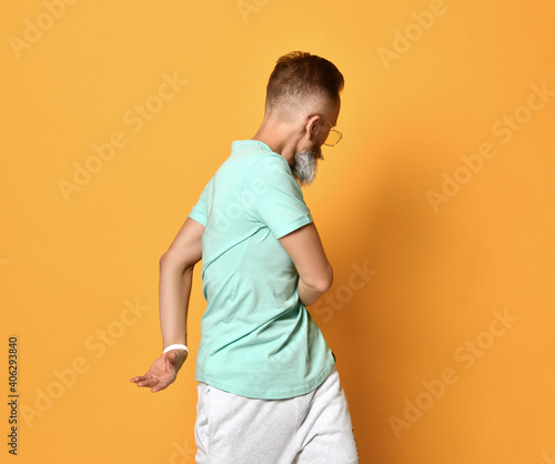 Active lifestyle. Stylish modern and cool funky trendy gray-haired hipster guy dancing and having fun on a bright orange background. Seniors lifestyle concept. Isolated.