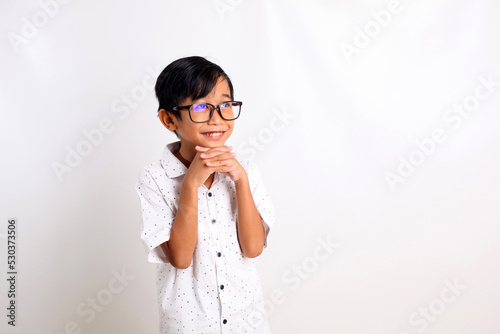 Admired asian schoolboy standing while looking up. Isolated on white background with copyspace