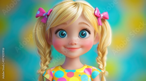 Adorable blonde girl with long pigtails adorned with colorful bows wearing a playful summer dress with vibrant circle patterns perfect for children s fashion photography