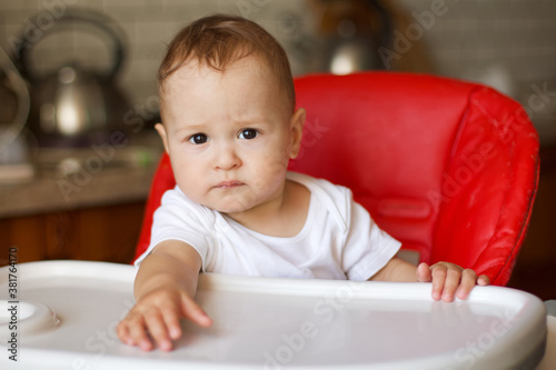 Adorable cute baby boy with a serious look sits in the highchair, close-up portrait.
