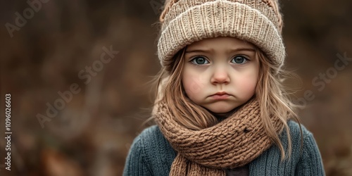 Adorable girl in a hat and knitted scarf displays a look of dissatisfaction. This small, adorable girl captures attention with her expressive face, showcasing her adorable charm amidst discontent.