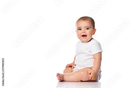 Adorable little baby smiling, sitting on the floor, studio shot, isolated on white background, lovely baby portrait