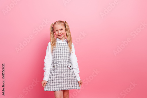 Adorable little schoolgirl in a formal uniform smiling against a pink background, symbolizing childhood learning and education