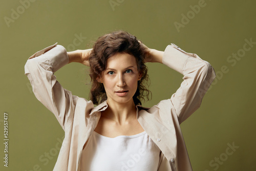 Adorable serious happy curly beautiful female in linen casual shirt touches hair looks at camera posing isolated on over olive green pastel background. People Lifestyle Emotions. Copy space