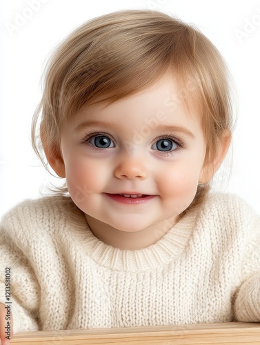Adorable Toddler Girl with Blue Eyes and Light Brown Hair Smiles in a Warm Studio Portrait