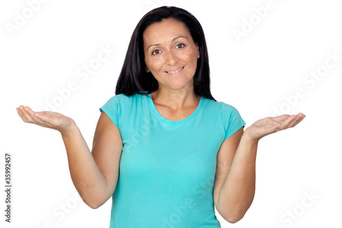 Adorable woman with blue t-shirt saying "sorry"