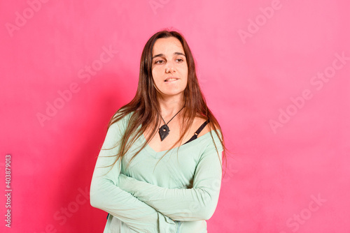 Adorable young woman with thoughtful, pensive gesture dressed casual, isolated on studio background.