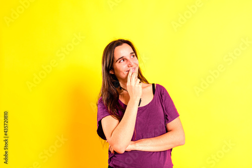 Adorable young woman with thoughtful, pensive gesture dressed casual, isolated on studio background.