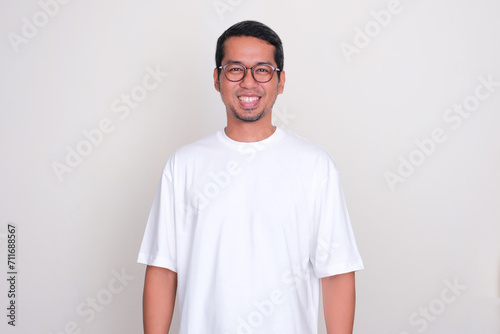 Adult Asian man wearing plain white t-shirt smiling at the camera