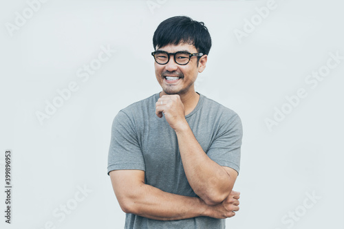 adult asian man.young male wear eye glasses.posing smiling look excited surprised thinking positive happy joy life.empty,copy space for text advertising.white background.attractive fashion people