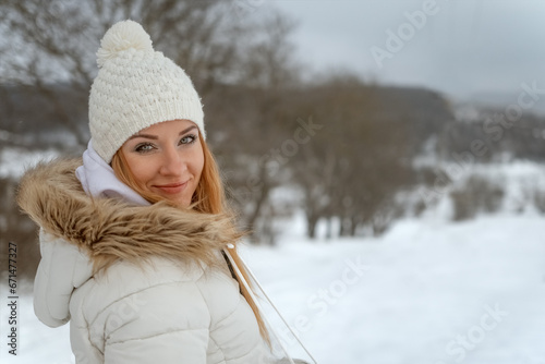 Adult attractive woman in knitted hat and white jacket looks into the camera and smiles. Girl in the winter outside.