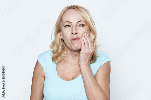 Adult girl looks away and holds her hand on tooth.