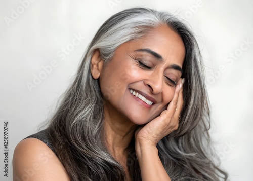 Adult Indian woman touch face with smooth healthy skin. Beautiful aging mature woman with long gray hair and happy shy smiling.