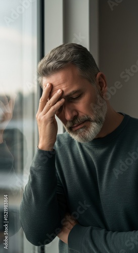 Adult male suffering from headache. Caucasian man feeling pain in his head. Health problem and medicine concept.