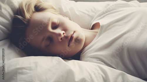 adult man with his head on the pillow in bed while sleeping, top view, close-up