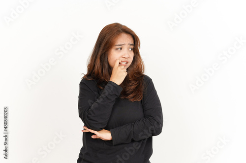 Afraid , nervous and bite nails Of Beautiful Asian Woman Wearing Black Shirt Isolated On White