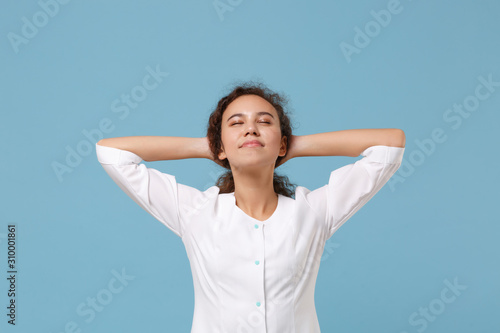 African american doctor woman isolated on blue background in studio. Female doctor in white medical gown sleep with hands behind head. Healthcare personnel health medicine concept. Mock up copy space.
