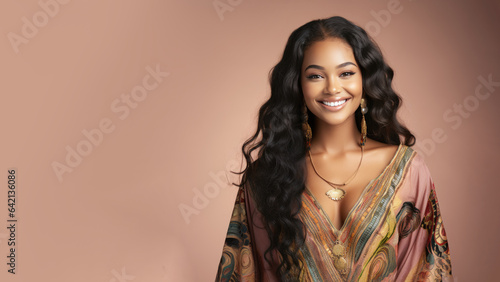 African american girl in traditional kaftan cloth, Smiling black woman, Curly hair in afro style