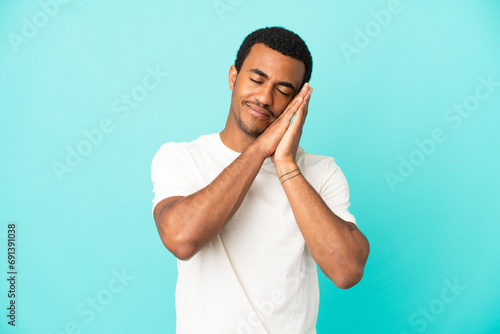 African American handsome man on isolated blue background making sleep gesture in dorable expression