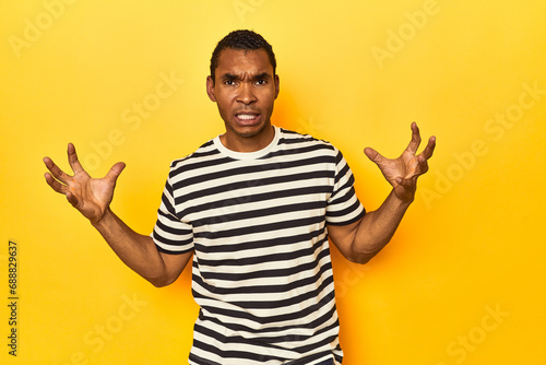 African American man in striped t-shirt, yellow studio, screaming with rage.