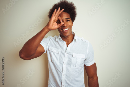 African american man with afro hair wearing shirt standing over isolated white background doing ok gesture with hand smiling, eye looking through fingers with happy face.
