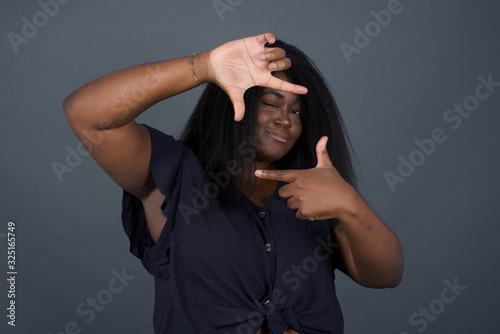 African American positive female with cheerful expression, dressed in casual light blue sweater, has good mood, gestures finger frame actively at camera.