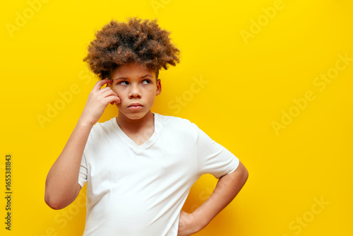 African American puzzled teenage boy in white t-shirt thinking and doubting on yellow isolated background, thoughtful insecure curly schoolboy kid scratching head and looking at copy space