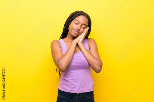 African American teenager girl with long braided hair over isolated yellow wall making sleep gesture in dorable expression