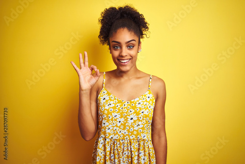 African american woman wearing casual floral dress standing over isolated yellow background smiling positive doing ok sign with hand and fingers. Successful expression.