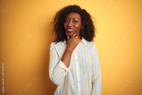 African american woman wearing striped shirt standing over isolated yellow background looking confident at the camera with smile with crossed arms and hand raised on chin. Thinking positive.
