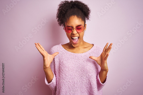 African american woman wearing winter sweater and sunglasses over isolated pink background celebrating mad and crazy for success with arms raised and closed eyes screaming excited. Winner concept