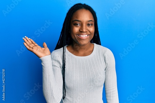 African american woman with braided hair wearing casual white sweater smiling cheerful presenting and pointing with palm of hand looking at the camera.