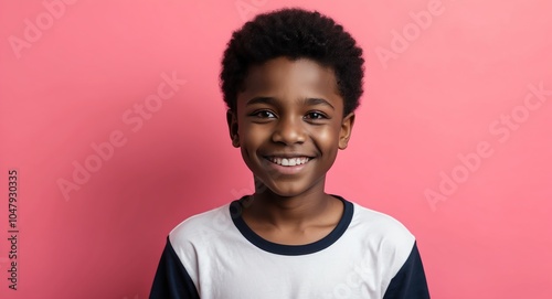 african teen boy pink background wearing plain white tshirt smiling happy portrait