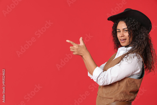 African-American cowgirl making gun with her hands on red background