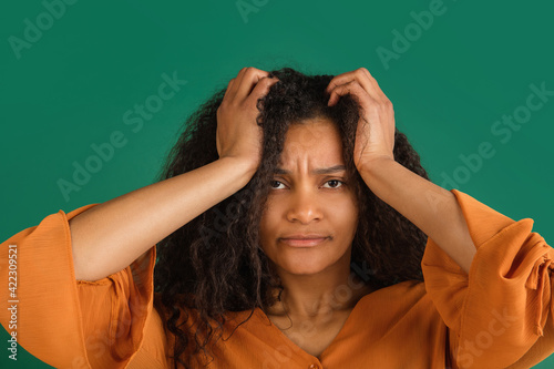 African-american woman portrait isolated on green studio background with copyspace