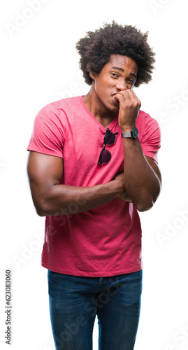 Afro american man over isolated background looking stressed and nervous with hands on mouth biting nails. Anxiety problem.