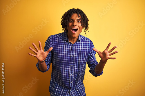 Afro man with dreadlocks wearing casual shirt standing over isolated yellow background celebrating crazy and amazed for success with arms raised and open eyes screaming excited. Winner concept