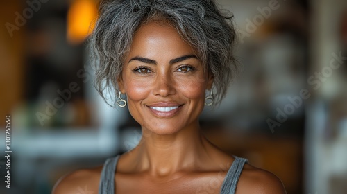 Against a neutral backdrop, a confident mature woman's warm smile conveys positivity and wisdom.