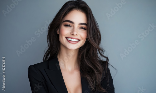 Against a simple background, a young professional woman in a formal suit exudes strength, confidence, and business style.