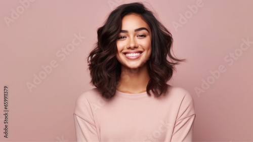 Against a soft, neutral studio background, a teenage girl's confident smile exudes positivity and self-assuredness.
