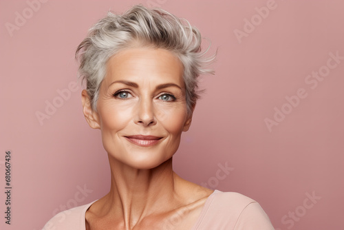 age positive concept: close up beauty shot of a 50 plus year old woman on a pastel brown background