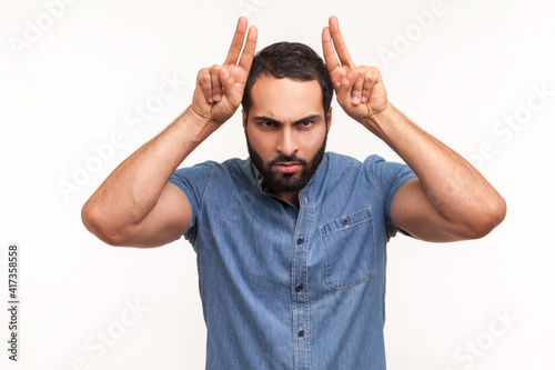 Aggressive bully man with beard holding fingers above head showing horns, arrogant and stubborn, ready to attack, looking at camera and threatening. Indoor studio shot isolated on white background