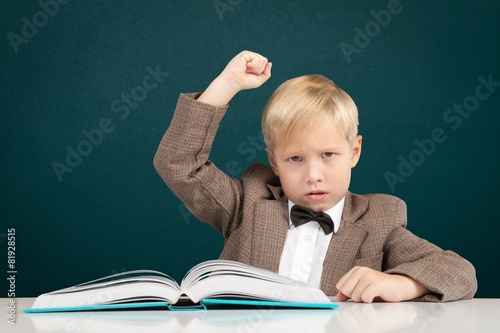 Aggressive. Confident elementary aged schoolboy sitting at the