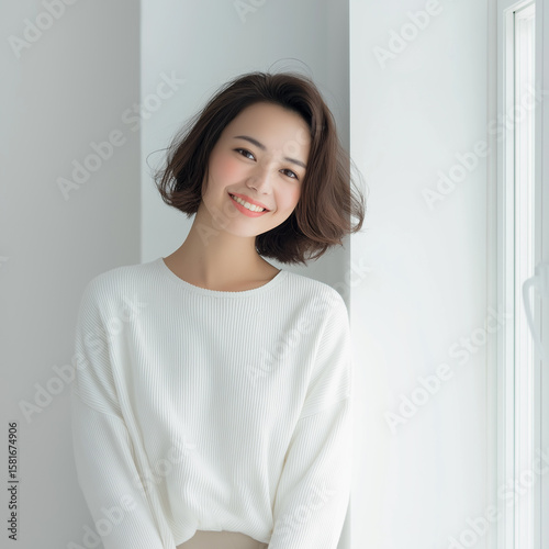 白い部屋で笑顔を見せるナチュラルな雰囲気の日本人女性「生成AI」