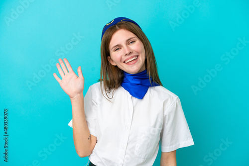 Airplane stewardess English woman isolated on blue background saluting with hand with happy expression