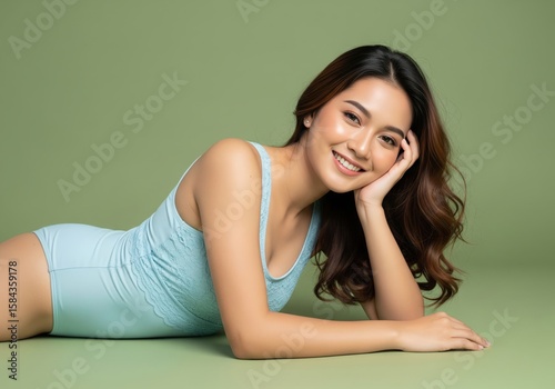 Alluring Indonesian beauty in sleek blue swimsuit poses comfortably, sparkling gaze and coy smile against muted green background