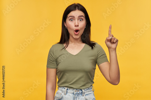 Amazed excited brunette young woman in casual clothes pointing up and having an idea isolated over yellow background Looking at camera