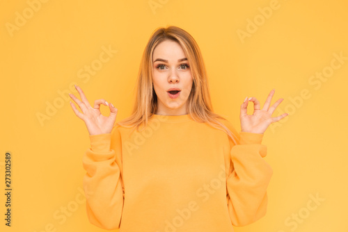 Amazed girl in orange clothing shows a gesture OK in her hands, looking into the camera with a shocking face on a yellow background. Cute girl blonde with astonished face shows sign OK. Isolated.