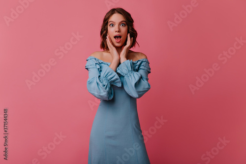 Amazed good-looking lady standing on rosy background. Stunning caucasian girl in long blue dress expressing surprised emotions.